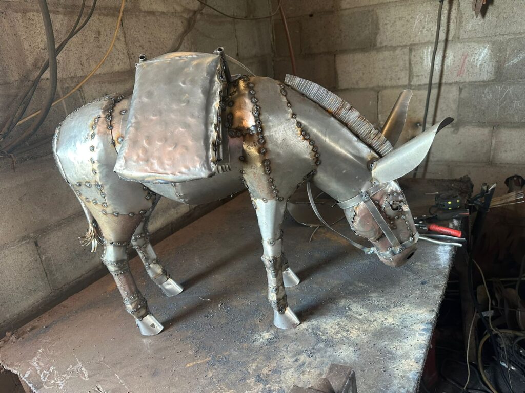 Descubre esta exclusiva creación en herrería artística: Burro en Herreria, una obra hecha completamente a mano que recrea con detalle y estilo la belleza de la naturaleza en metal. Esta pieza representa un mexicano con una bandeja en mano, con un diseño que combina elegancia, fuerza y durabilidad.